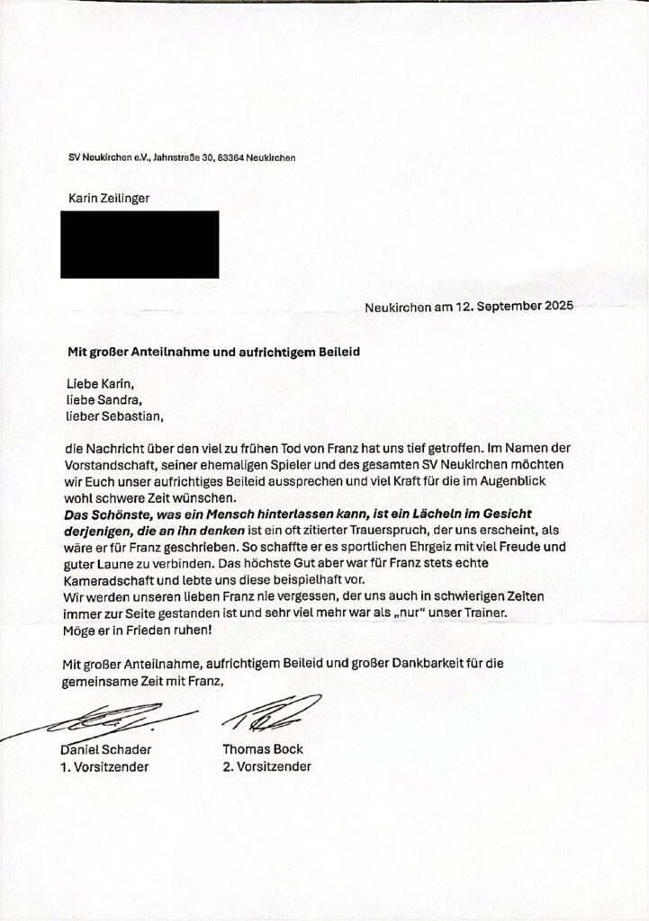 Der SV Neukirchen trauert um seinen höchstgeschätzten, langjährigen und leider viel zu früh verstorbenen Trainer Franz Zeilinger und möchte alle Vereinsmitglieder, Freunde und Wegbegleiter zur gemeinsamen Heiligen Messe für Franz einladen.