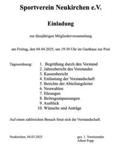 Vorheriger Beitrag Einladung zur diesjährigen Mitgliederversammlung Nächster Beitrag Neikira hod zamgramd Ähnliche Beiträge NEIKIRA ramd zamMärz 17, 2026 Aufstieg U19 JFG TeisenbergNovember 20, 2025 Der SV Neukirchen trauert um Franz Zeilinger – Heilige Messe für Franz und alle verstorbenen Mitglieder am 07. DezemberNovember 11, 2025